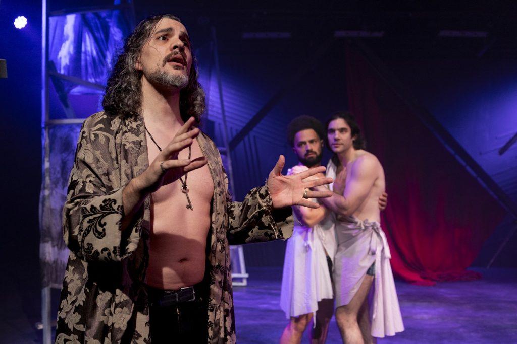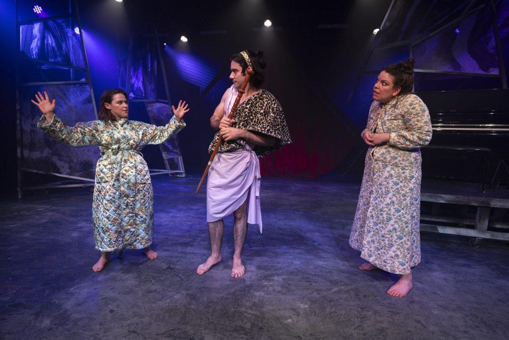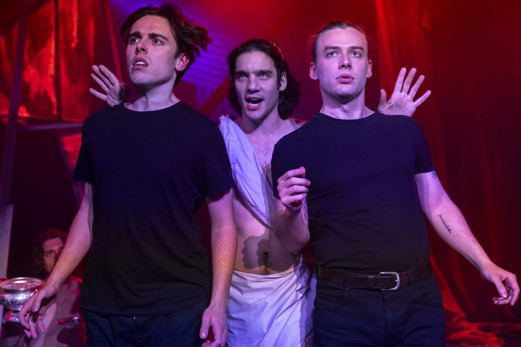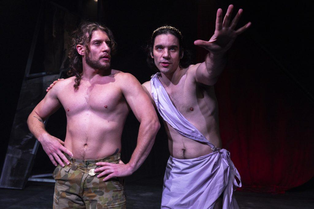 Chaotically unhinged, The Frogs makes you giggle from the beginning. We meet Dionysus – God of theatre, wine, and orgies, played hilariously by the very likable Pat Mandziy. His long-suffering servant Xanthias (Eddy O’Leary), who provides a perfect foil to the flighty and camp Dionysus, also delivers some fantastic zingers.