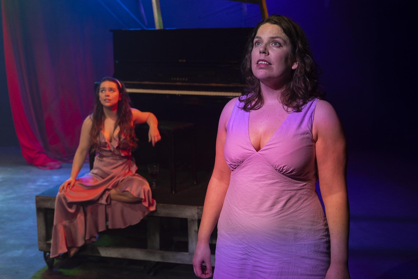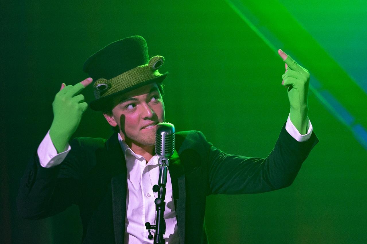 Tom Bannerman’s set features green sails and a movable piano on a wheeled platform, enabling smooth transitions between scenes. Josh Carter’s costumes include togas, leopard print, and lots of lovely froggy green.